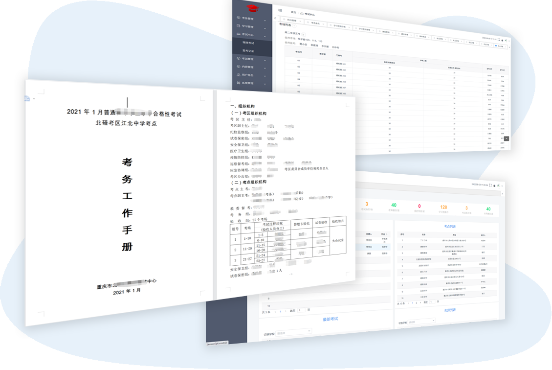 • 快捷的考場生成和安排功能,可幫助考式中心、考點快速安排考場和監(jiān)考老師。